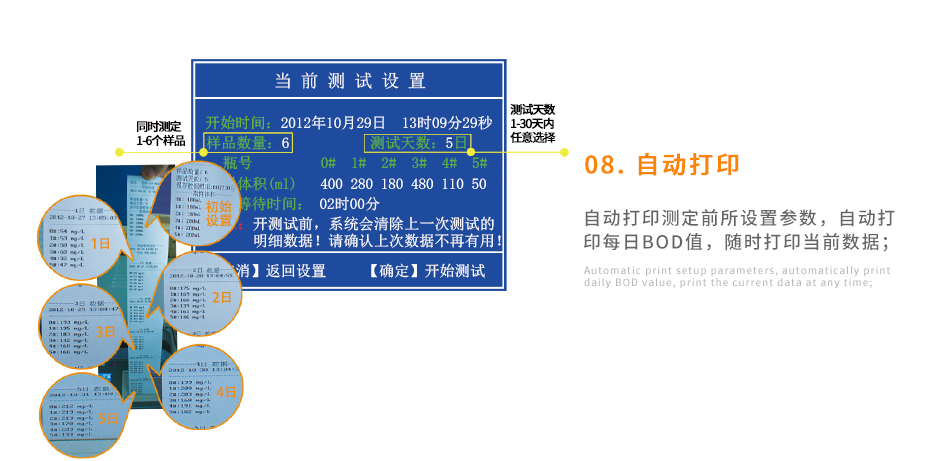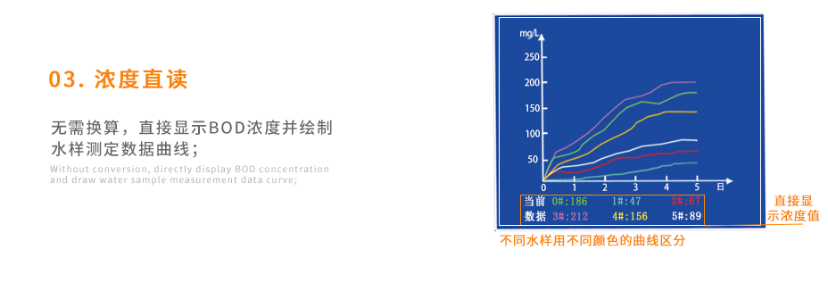 可以同時測量6個樣品無需換算、直接顯示BOD濃度值;